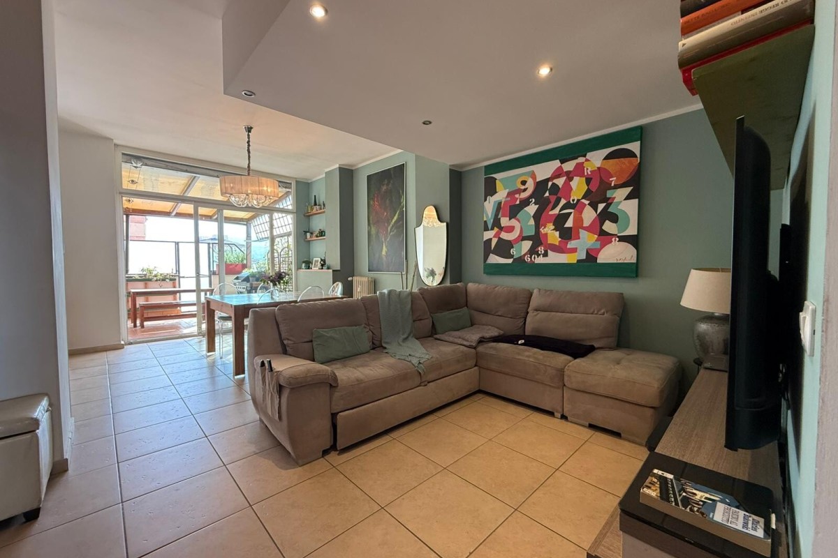 - Zona giorno open space: ampio living con cucina a vista, ambiente luminoso e accogliente con accesso diretto a un grande terrazzo angolare a L, perfetto per momenti di relax all’aperto